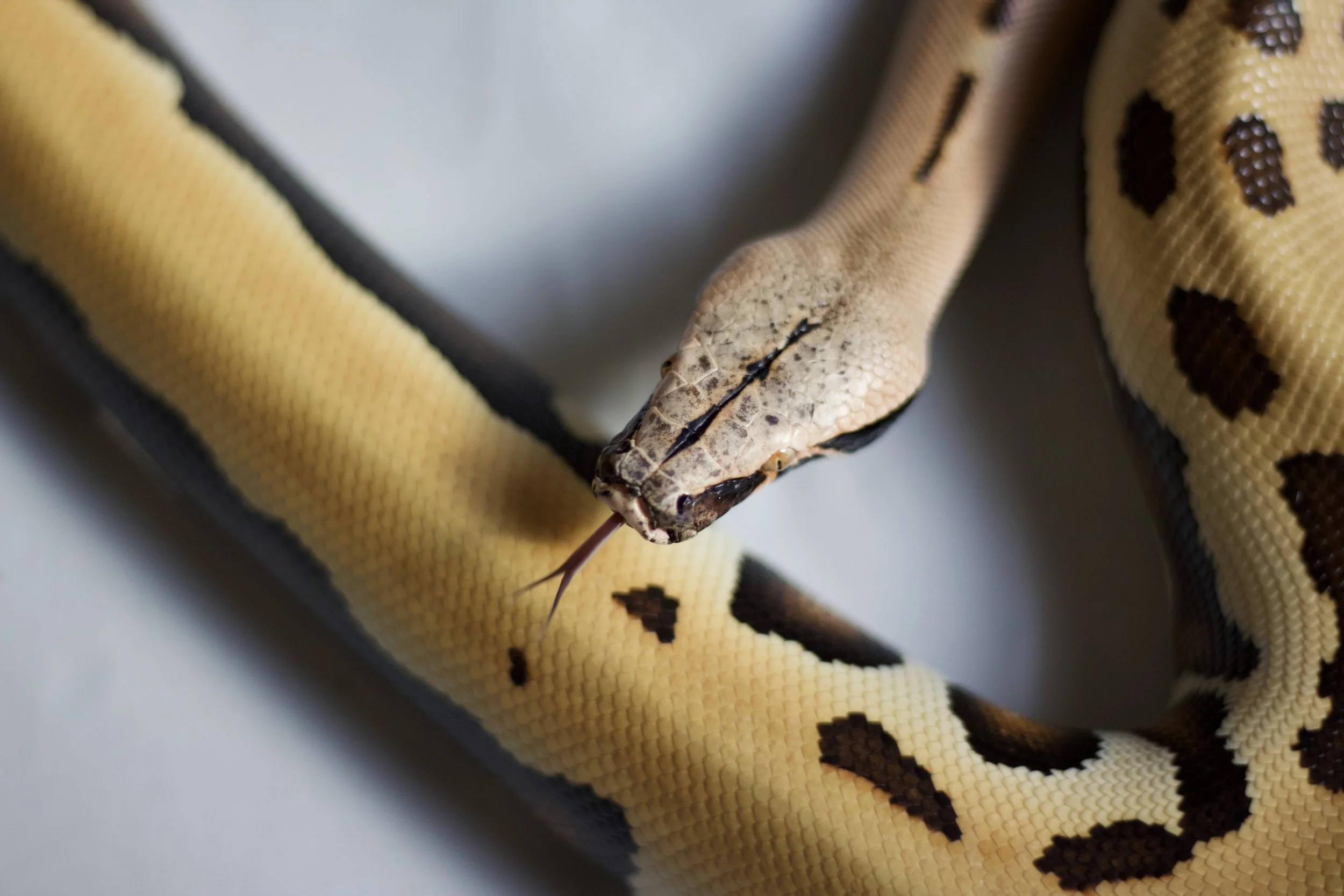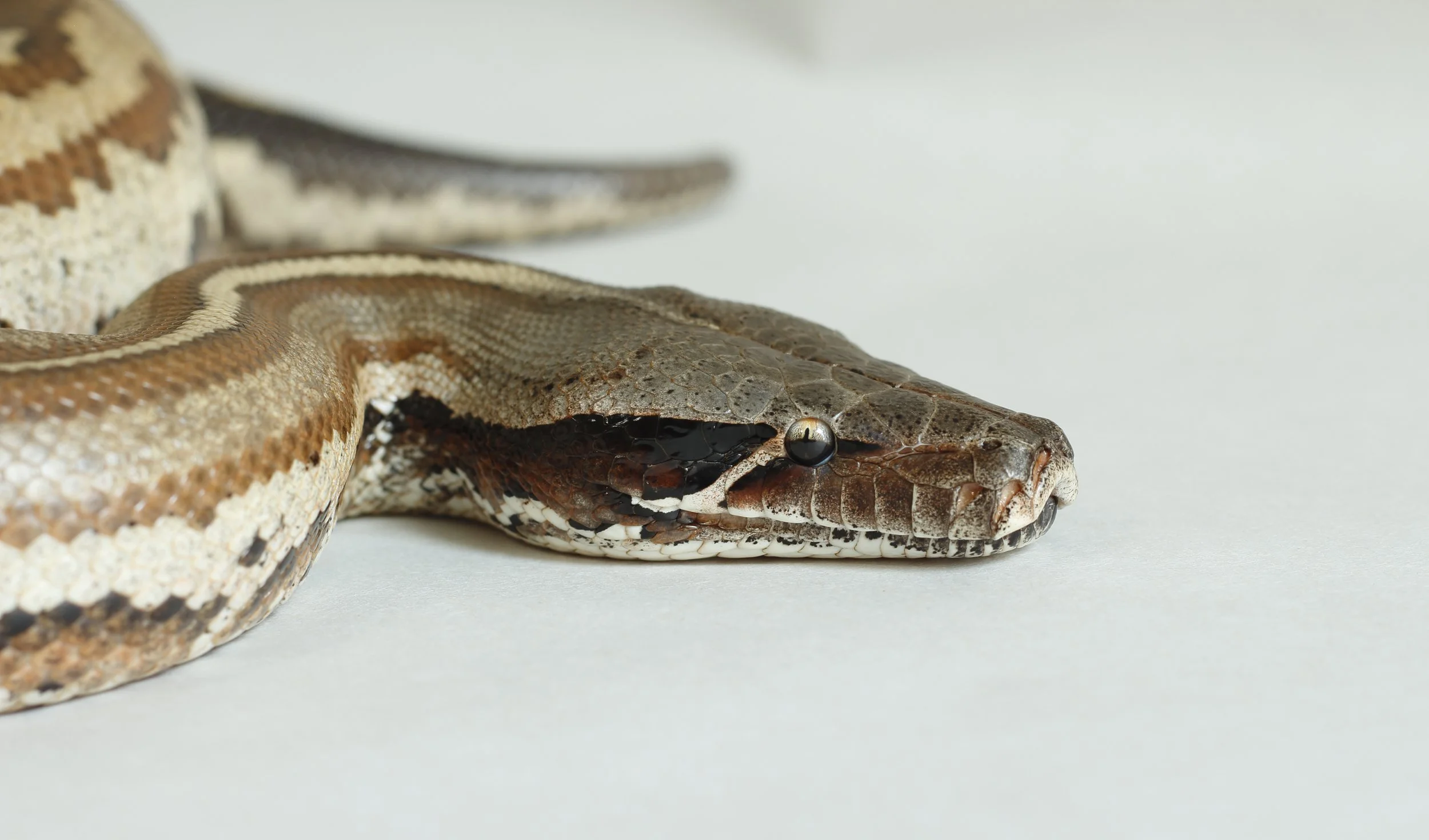 The belly pattern is reduced. The darker big spots commonly seen in Normal Bloods appear fragmented in tiny dots in Matrix animals, leaving the ventral scales with little pattern.