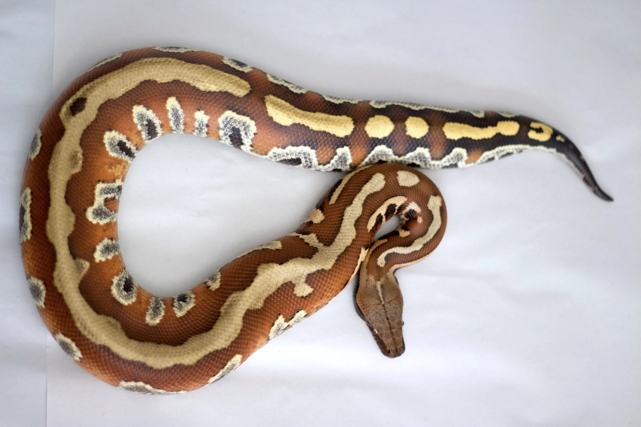 The super form of Pollen (homozygous) is the Flower. This is one of the prettiest blood python morphs out there. The pattern turns into an extreme amplification of the Pollen gene. The two main characteristics of the Flower mutation are its vibrant colors and its unique and well-defined wavy dorsal striped pattern ("Petal" like loops). Some Flowers can also display a hypomelanistic trait, with very low black pigments on the pattern.